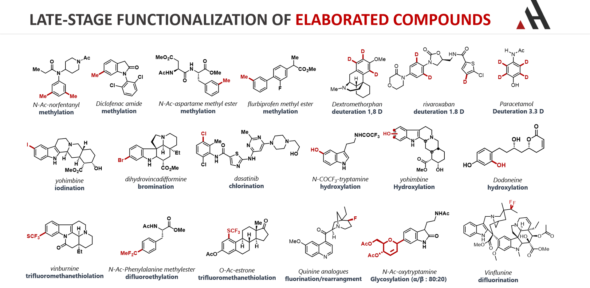 ACTIV-H fournit une approche polyvalente et exclusive permettant des modifications sélectives à des positions non activées ou métaboliquement sensibles de produits naturels issus de la biomasse, d'API ou d'entités chimiques.
