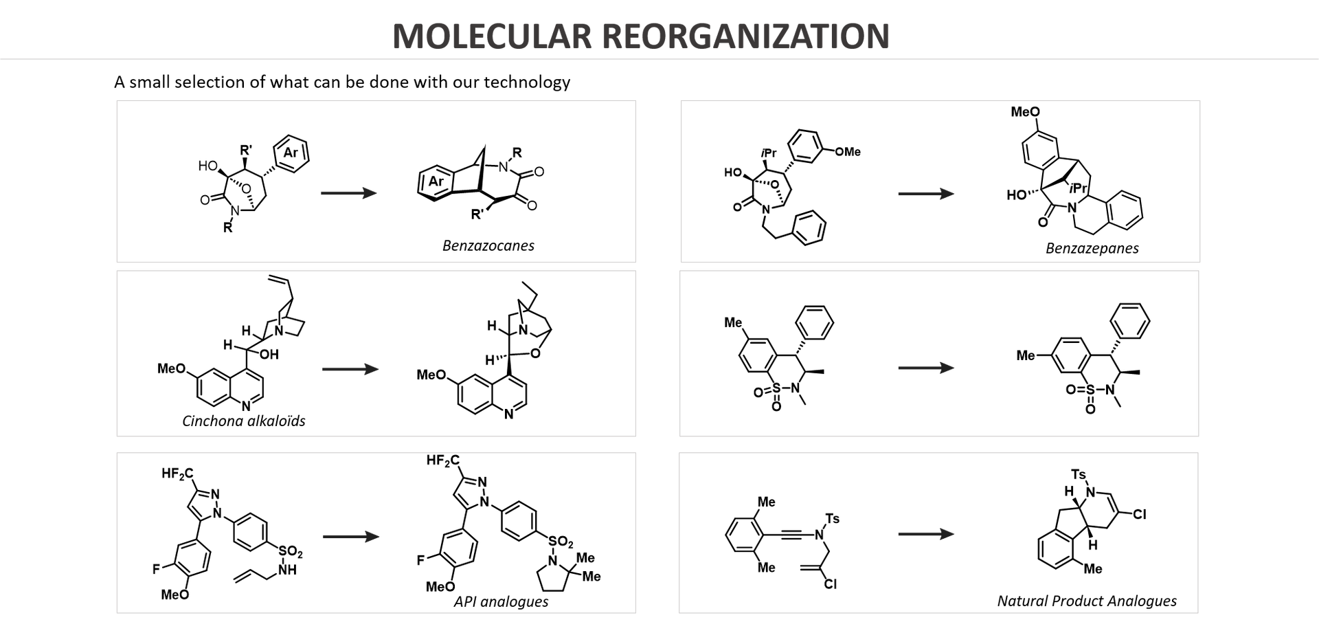 Notre technologie et notre expertise offrent une boîte à outils unique pour résoudre les problèmes de synthèse et de réactivité, avec la possibilité d'accéder à vos molécules ciblées ou de découvrir de nouvelles transformations.
