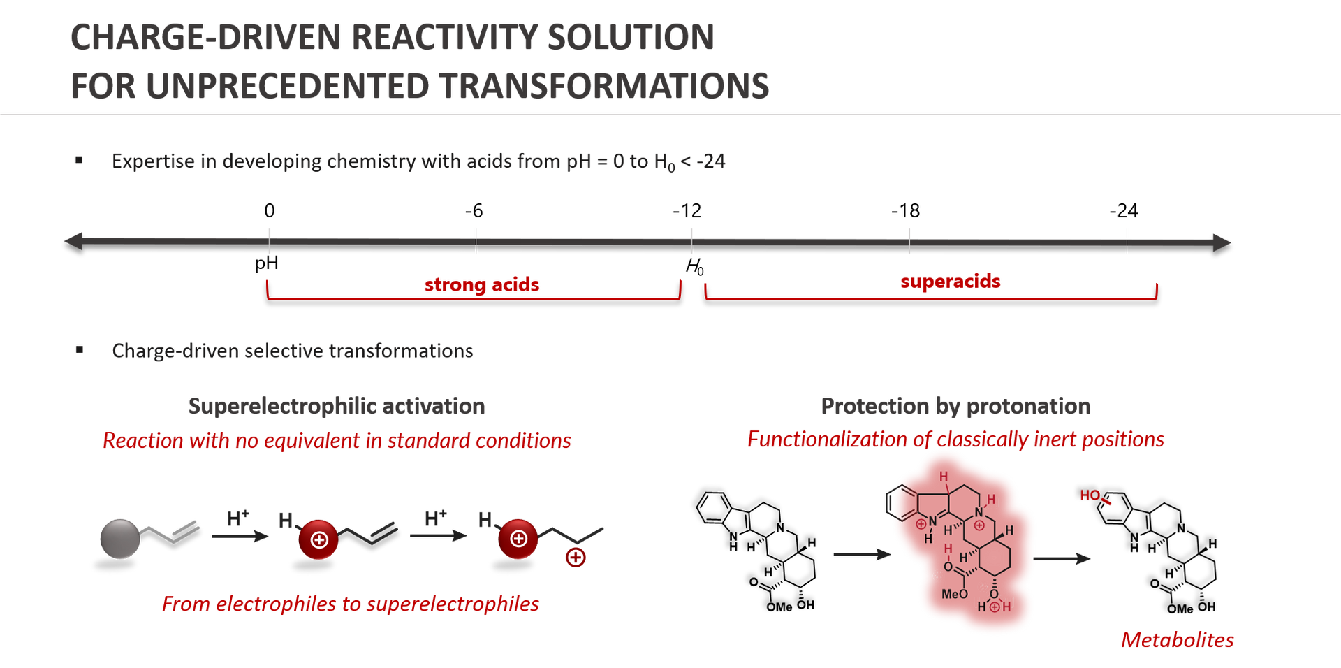 Notre mission est avant tout de rendre accessible des molécules uniques par le biais de transformations médiées par la charge. Nous possédons une grande expertise des des milieux acides présentant un pH négatif de 0 à superacides avec une valeur de Hammet de -24. Par conséquent, dans ces conditions la réactivité des molécules passe totalement d'un comportement cationique standard à une chimie superélectrophile unique.